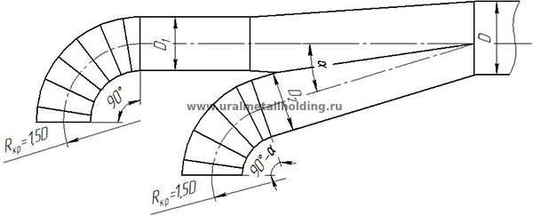 Технические условия на изготовление фасонных частей аспирационных систем предусматривают стандартные тройники с центральным углом a=30° при диаметре нижнего основания ствола D до 630 мм включительно и с центральным углом a=45° при диаметре нижнего основания ствола D, равного или больше 710 мм. Такие тройники сварные дают возможность успешно использовать существующие стандартные отводы, для того чтобы выполнять разнообразные детали систем промышленной вентиляции.